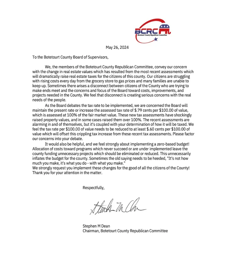 Steve Dean's Letter to the BOS Concerning Property Taxes